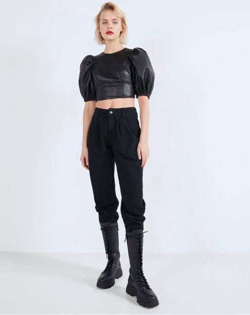 Faux leather blouse with voluminous sleeves